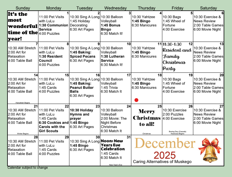 Each resident at Caring Alternatives of Muskego enjoys a spacious private room equipped with a full bath, cable TV, climate-controlled thermostat, and phone jack, offering all the conveniences of home with added care. For moments of relaxation and self-care, residents can visit the full-service beauty salon, which provides hair and grooming services to help them look and feel their best. A soothing whirlpool spa room is also available, offering a serene environment for unwinding and rejuvenation.