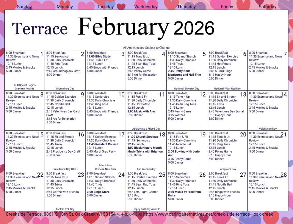 Creek Side Terrace is a charming, intimate facility offering 25 private, thoughtfully designed units. Each spacious residence includes a full bath, ensuring both comfort and privacy. For couples or individuals seeking more space, we offer four luxurious suites designed to feel like a home away from home. Our peaceful environment is ideal for those looking to maintain independence while receiving personalized, compassionate care.
