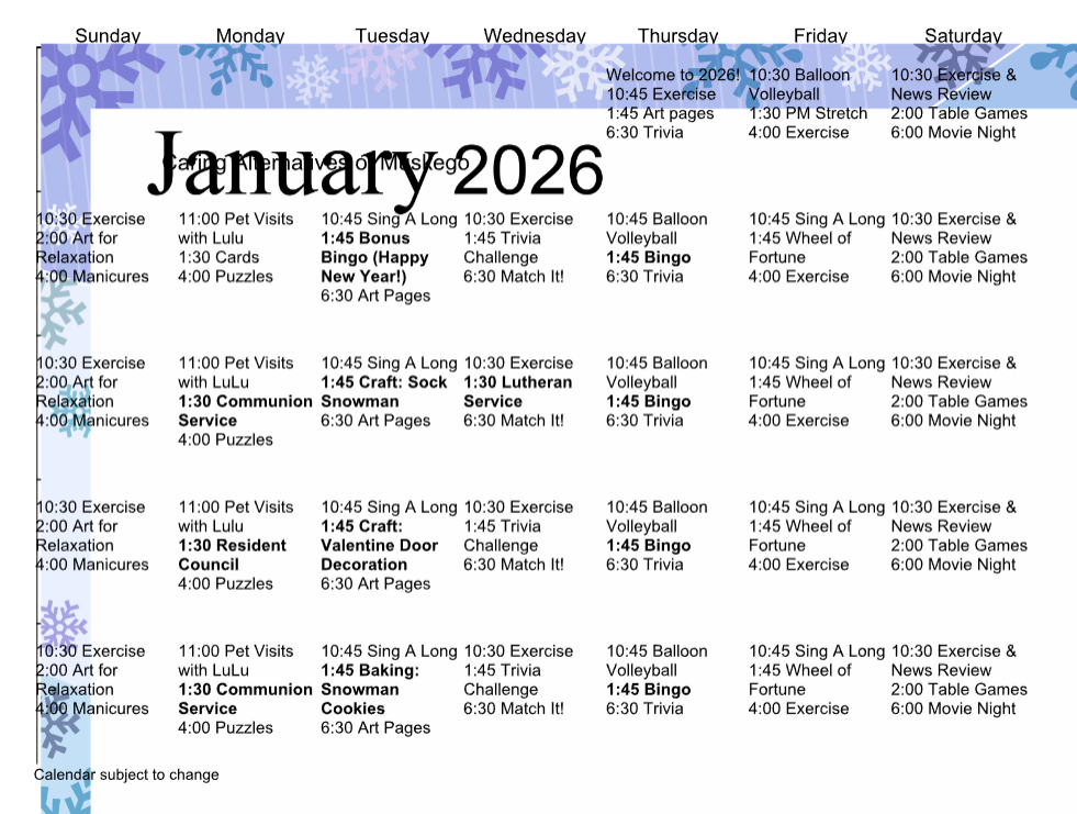 Caring Alternatives of Muskego is a beautifully designed, newly constructed community featuring 30 spacious units. Each private unit includes a full bath, personalized climate control, cable TV, and a phone jack, ensuring every resident’s comfort and convenience. For those seeking additional space, we offer four two-room suites, perfect for couples or residents desiring extra room to call their own. Located in a peaceful area with convenient access to local amenities, Caring Alternatives of Muskego combines modern comforts with a warm, home-like atmosphere.