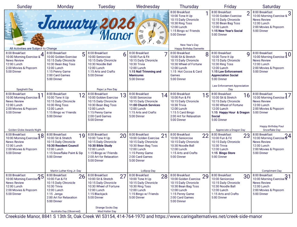 Conveniently nestled near Oak Creek’s top medical facilities, churches, shopping centers, and restaurants; Creek Side Manor combines the tranquility of home with easy access to local conveniences. Here, we pride ourselves on fostering a warm, engaging environment where residents can enjoy a balanced lifestyle filled with comfort, independence, and community.