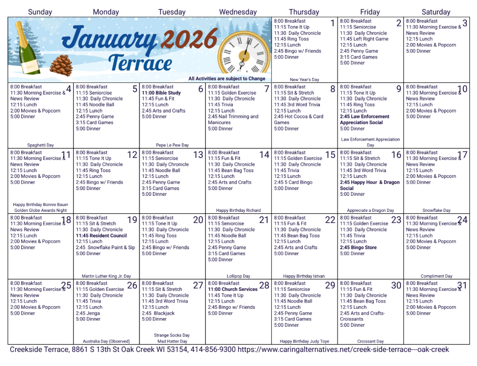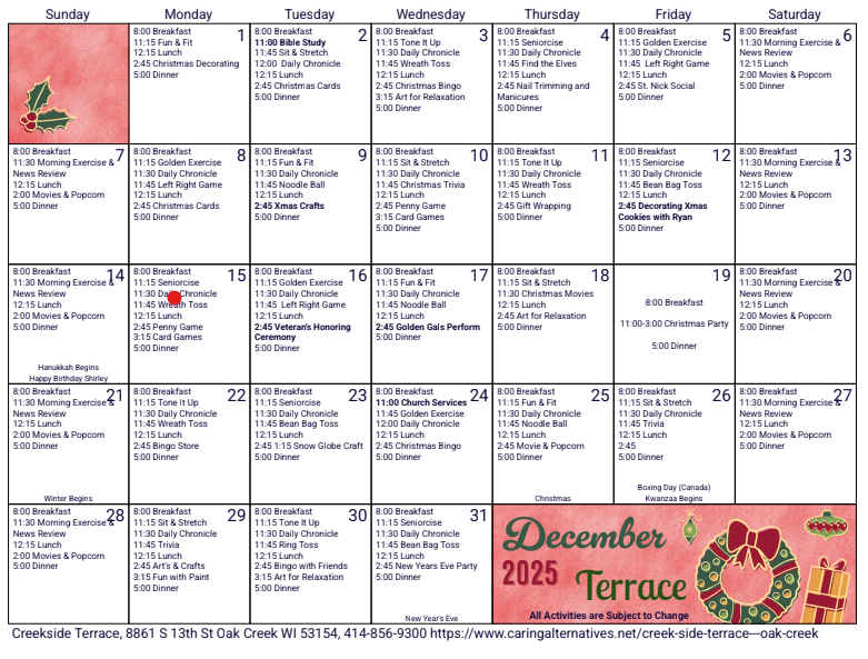 Creek Side Terrace is a charming, intimate facility offering 25 private, thoughtfully designed units. Each spacious residence includes a full bath, ensuring both comfort and privacy. For couples or individuals seeking more space, we offer four luxurious suites designed to feel like a home away from home. Our peaceful environment is ideal for those looking to maintain independence while receiving personalized, compassionate care.